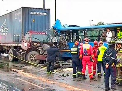 Unas diez ambulancias llegaron a atender la emergencia registrada hacia las 4:30 de la madrugada del lunes cuando, según testigos, el conductor del SITP perdió el control del bus al intentar evadir un choque con otro vehículo y terminó invadiendo el otro carril estrellándose contra el tractocamión.